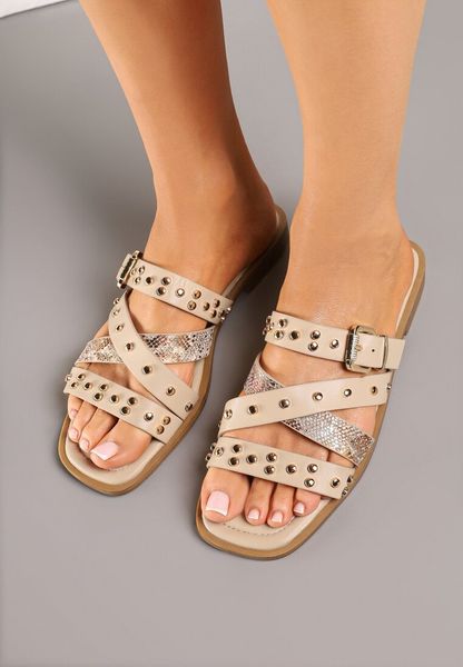 Ciemnobeżowe Klapki Ozdobione Klamrą i Nitami Ronilene