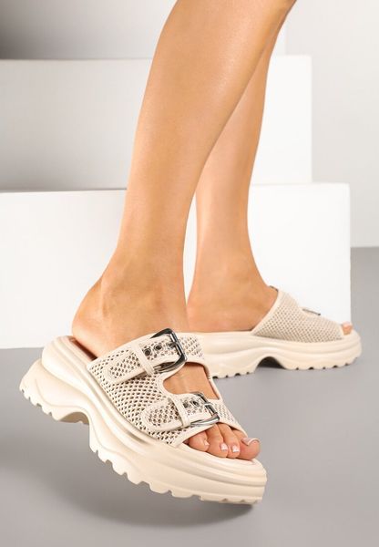 Beżowe Klapki na Tłoczonej Platformie Zdobione Klamrami i Plecionką Mlerra