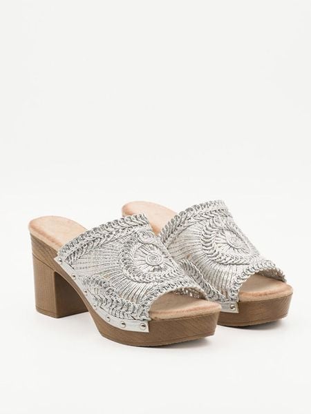 – zapięcie: bez- noski: otwarte- powierzchnia: z metalicznym połyskiem- detale: plecionka, ozdobne nity- forma obcasa: blokowy- podeszwa: antypoślizgowa