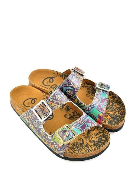 – materiał wierzchni ze skóry syntetycznej- zapięcie: sprzączka- noski: otwarte- powierzchnia: wzorzysta- wkładka: ergonomicznie formowana- podeszwa: antypoślizgowa