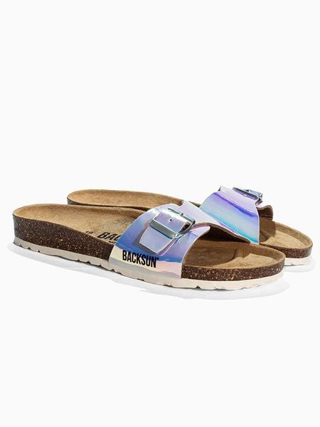– materiał wierzchni ze skóry syntetycznej- powierzchnia: z metalicznym połyskiem- zapięcie: sprzączka- noski: otwarte- skórzana wkładka: tak- podeszwa: antypoślizgowa