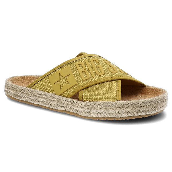 Klapki damskie Big Star, materiał tekstylny z szerokim paskiem z logo na cholewce miękką wkładką, żółte, JJ274A409