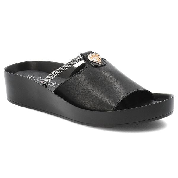 Klapki damskie S. Barski, ze skóry naturalnej na platformie z ozdobą eleganckie, czarne, KV51-034