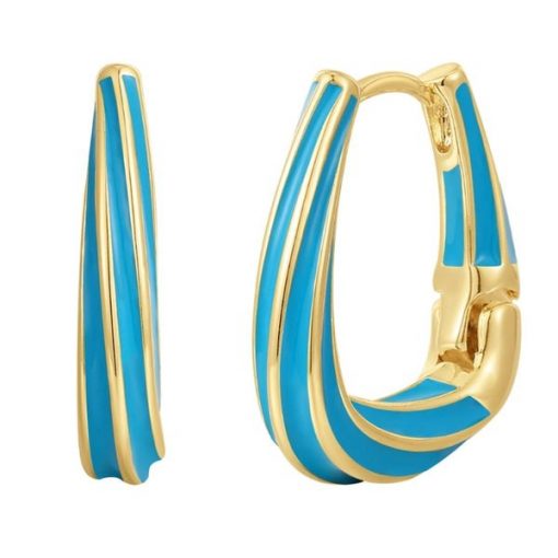 INFORMACJE OGÓLNE: Rodzaj kolczyków: Kolczyki kreolki Grupa docelowa: Kobiety MATERIAŁ: Materiał podstawowy: Mosiadz Kolor materiału podstawowego: Żółte złoto Emalia: Niebieski Powłoka: Pozłacany 14-karatowym żółtym złotem Wykończenie powierzchni: Polerowana na wysoki połysk WYMIARY: Wysokość kolczyka w mm, w przybliżeniu:22,5 Szerokość kolczyka w mm, w przybliżeniu: 5,3