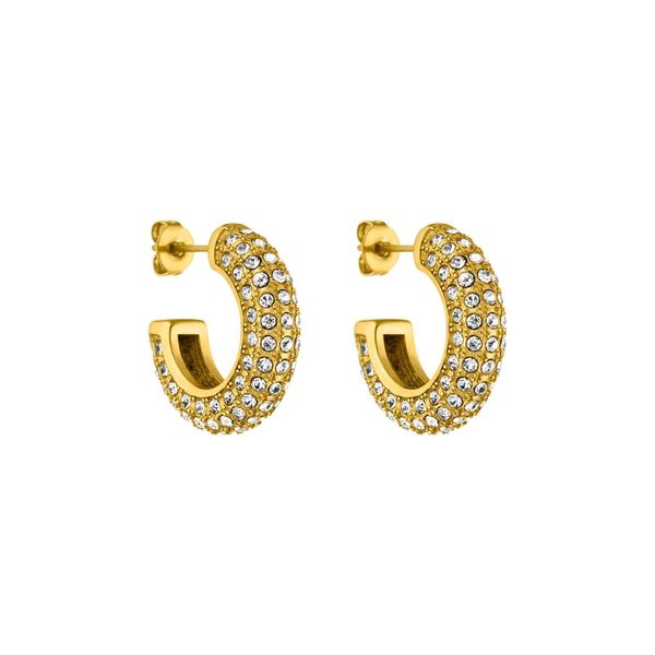 Kolczyki koła wysadzane błyszczącymi kamieniami szlachetnymi dodadzą każdemu strojowi wyjątkowego blasku. Materiał: Złoto: stal nierdzewna platerowana 18-karatowym złotem Srebro: stal nierdzewna Różowe złoto: stal nierdzewna platerowana 18-karatowym różowym złotem Kamienie szlachetne: cyrkonia (biała) Rozmiar: średnica 20 mm, szerokość 5,5 mm Waga: 7,48 g
