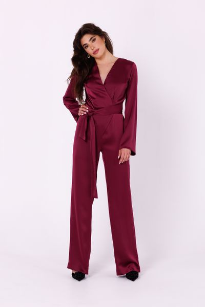 Satynowy Kombinezon z Kopertowym Dekoltem – Bordowy