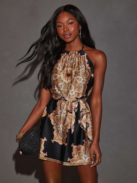 – ramiączka: na szyję- dekolt: okrągły- szlufki na pasek: tak- zdejmowany pasek: tkanina- krój: taliowany- wzór: na całościUwaga: Przy wyborze właściwego wariantu zaleca się korzystanie z tabeli rozmiarów.