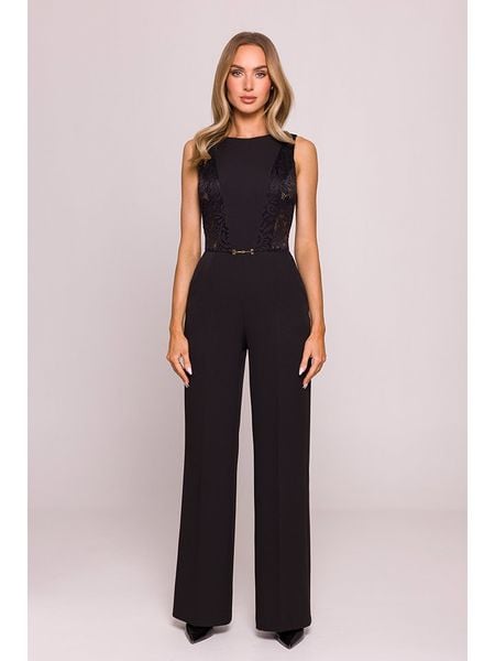 – dekolt: okrągły- zapięcie: suwak z tyłu- ramiączka: szerokie- kieszenie: wpuszczane- krój: taliowany- detale: szydełkowana koronka, kant, aplikacje- zakończenia nogawek: dzwony- look: jednokolorowy