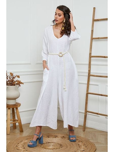 – czysty len- dekolt: V- zakończenia nogawek: dzwony- krój: oversized- look: jednokolorowyUwaga: Przesyłka nie zawiera paska.