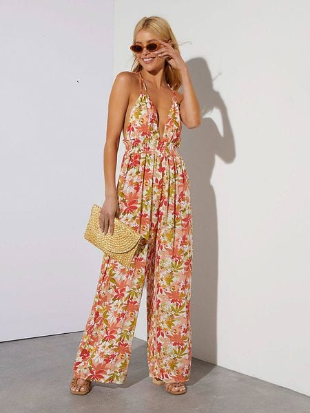 – ramiączka: wąskie- dekolt: V- zapięcie: wiązanie na plecach- talia: elastyczna- krój nogawek: Wide Leg- krój: luźny- wzór: kwiatowyUwaga: Przy wyborze właściwego wariantu zaleca się korzystanie z tabeli rozmiarów.