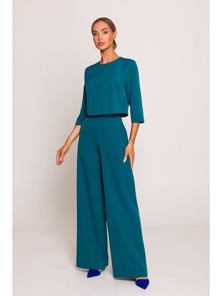 – dekolt: okrągły- zapięcie: suwak z tyłu- długość rękawa: półdługi- kieszenie: wpuszczane- zakończenia nogawek: dzwony- krój: prosty- look: jednokolorowy