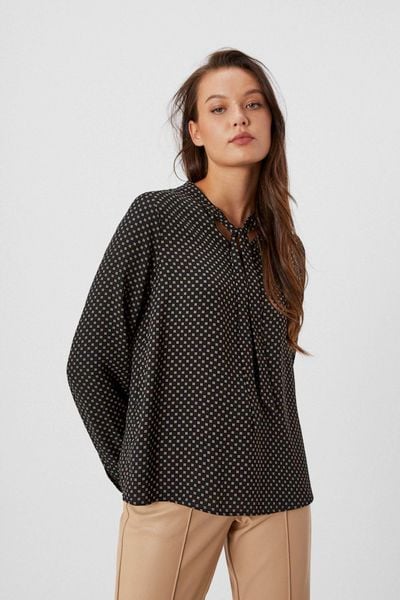 100% POLIESTER Koszula, czarny, kwiaty, roślinny, Poliester, wiązanie, długi rękaw, mankiety, zapięcie , dekolt, Stójka, Wiązany, brak
