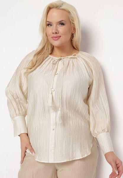 Beżowa Koszula Wiskozowa z Guzikami Ozdobnymi i Troczkami Aulina