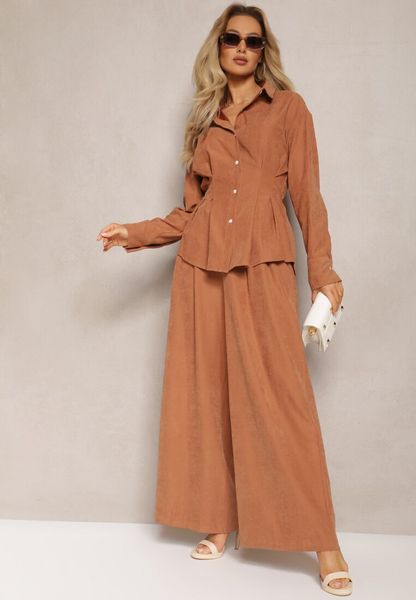 Brązowy Komplet Luźne Spodnie na Gumce i Dłuższa Koszula Wiązana na Plecach Darienas
