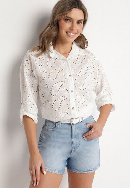 Biała Koszula z Bawełnianej Tkanin z Ażurowym Wzorem Reilianne