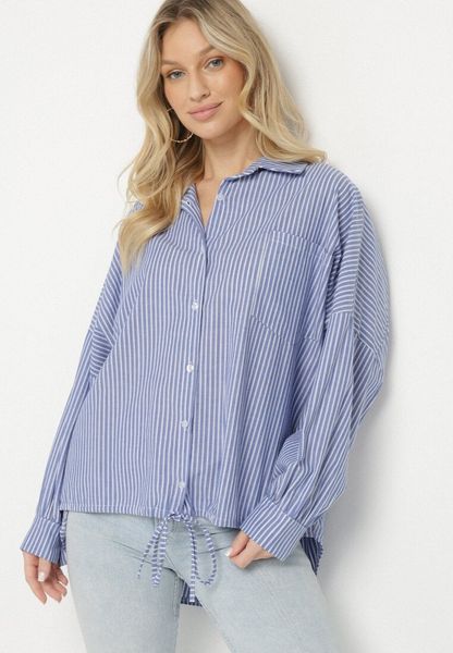Niebieska Bawełniana Koszula Oversize w Paski ze Ściągaczem Elineola