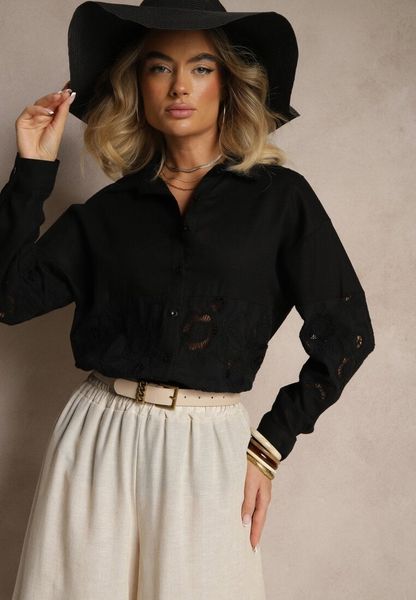 Czarna Koszula Oversize z Lnem Zdobiona Ażurowymi Wstawkami Dannivra