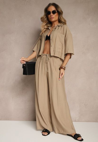 Ciemnobeżowy Komplet z Wiskozy o Kroju Oversize Koszula i Spodnie Dovaraella