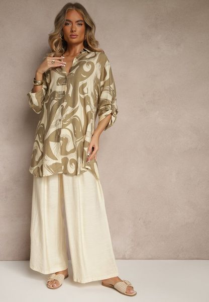 Jasnobeżowy Komplet z Wiskozą Spodnie i Koszula z Geometrycznym Wzorem Lirare