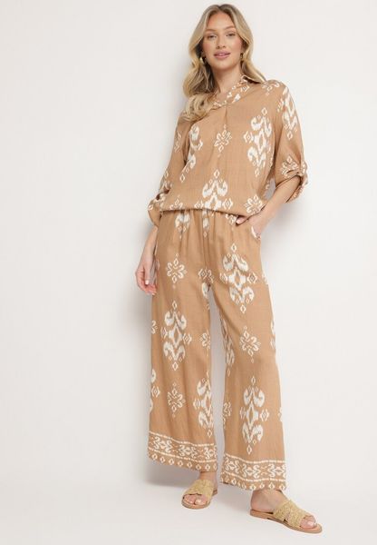 Brązowy Komplet z Wiskozą w Etniczny Wzór Koszula i Spodnie Meporelle