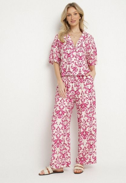 Różowy Komplet z Wiskozy w Ornamentalny Wzór Koszula i Spodnie Evialirae