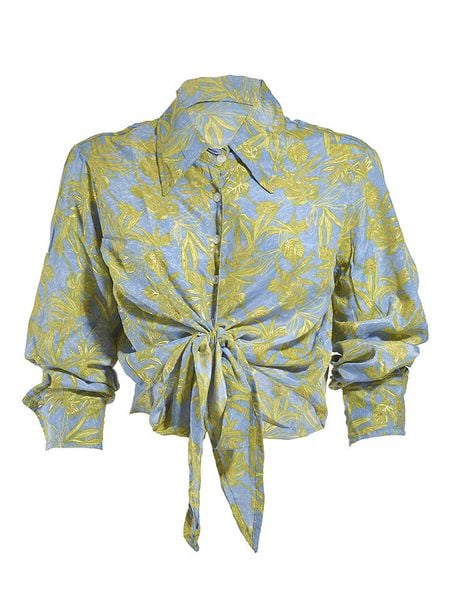 – kołnierz: kent- zapięcie: listwa guzikowa- detale: ozdobne wiązanie- krój: prosty- wzór: na całości