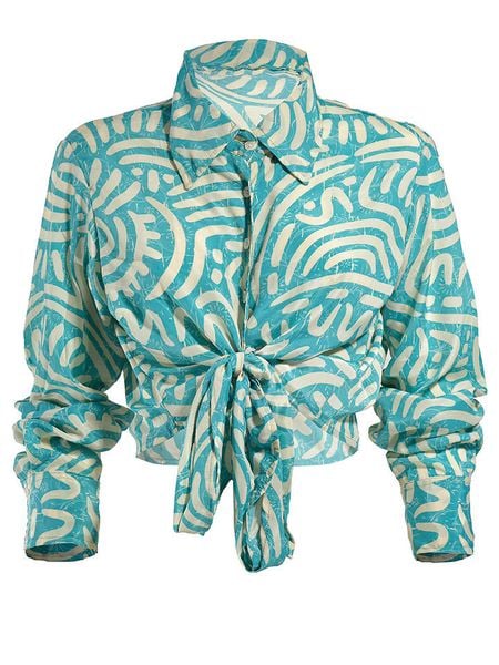 – kołnierz: kent- zapięcie: listwa guzikowa- detale: ozdobne wiązanie- krój: prosty- wzór: na całości