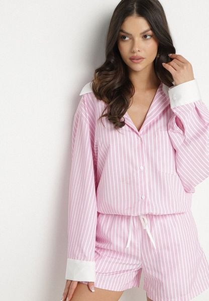 Różowa Koszula w Paski z Kontrastowymi Mankietami i Kołnierzykiem Zarona