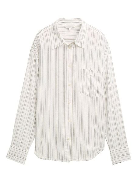 – z dodatkiem lnu- kołnierz: kent- zapięcie: listwa guzikowa- kieszenie: na piersi- zakończenie rękawów: guziki- dolny brzeg: zaokrąglony- krój: prosty- wzór: paski