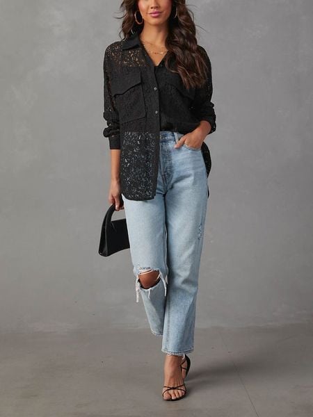 – kołnierz: kent- zapięcie: listwa guzikowa- kieszenie: na piersi- zakończenie rękawów: mankiet na guzik- dolny brzeg: zaokrąglony- detale: szydełkowana koronka- krój: prosty- look: jednokolorowy