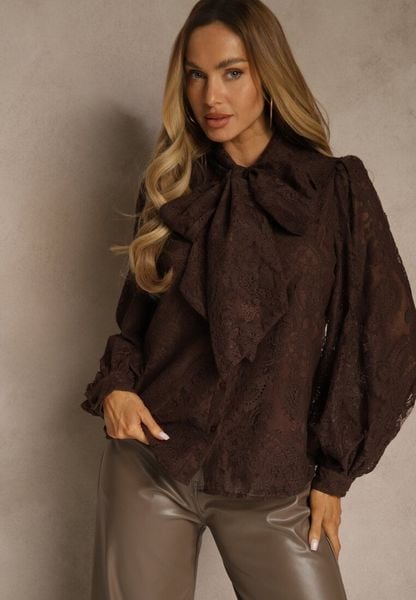 Brązowa Koszula z Koronki Zdobiona Bufiastymi Rękawami i Kokardą przy Dekolcie Sewene