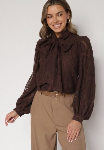 Brązowa Koronkowa Koszula z Bufiastymi Rękawami i Kokardą przy Dekolcie Sewane