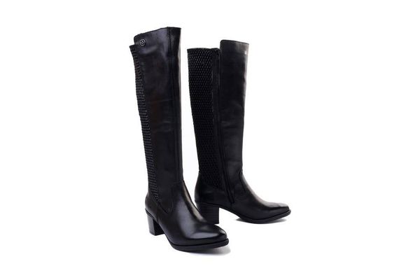 Kozaki damskie. Ocieplone futerkiem. Zapięcie na zamek. Guma ściągająca. Regulowany obwód cholewki. Wygodny, stabilny obcas typu słupek. Antypoślizgowa podeszwa.
