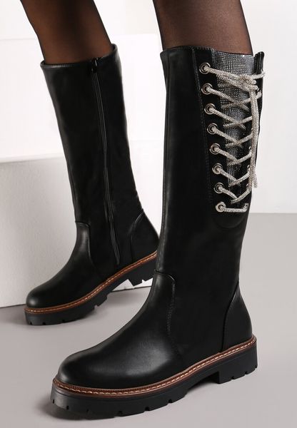 Czarne Kozaki z Cholewką Przed Kolano i Wiązaniem ze Sznurowadeł z Cyrkoniami Suvella