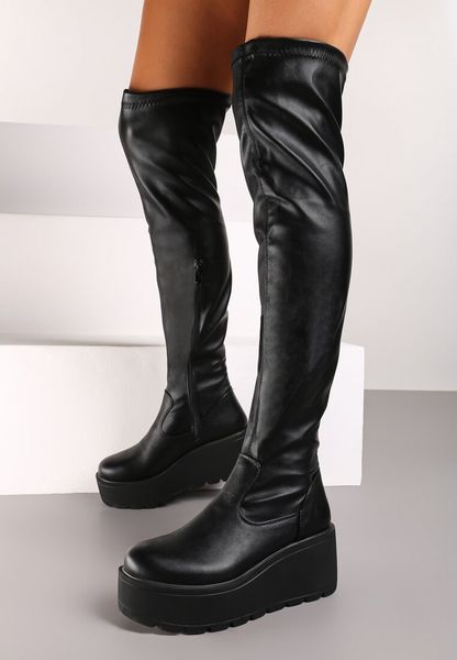 Czarne Kozaki na Koturnie i Platformie ze Skóry Ekologicznej z Dopasowaną Cholewką Eriveti