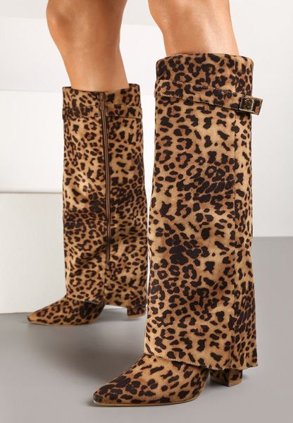 Brązowe Kozaki w Panterkę na Słupku z Wywiniętą Cholewką Gafsena