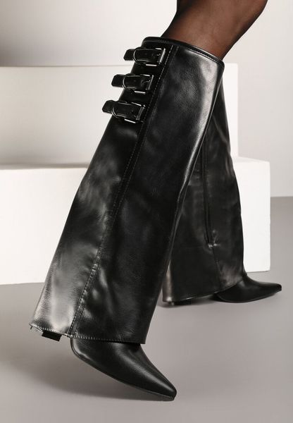 Czarne Kozaki na Słupku z Wywiniętą Cholewką Klamrami i Paskami Renniel