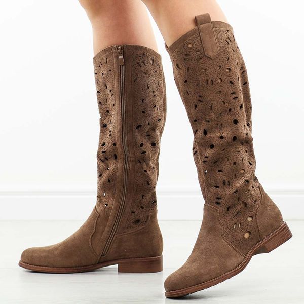 Ciemnobeżowe kozaki damskie w odcieniu kawyto elegancki wybór na wiosnę, lato i jesień. Wykonane z wysokiej jakości materiału zamszopodobnego, prezentują modny ażurowy wzór, który dodaje lekkości i zapewnia przewiewność. Klasyczny okrągły nosek oraz praktyczne zapięcie na suwak sprawiają, że buty są wygodne w codziennym użytkowaniu. Wnętrze kozaków zostało wykończone miękką tkaniną i jest nieocieplane, co czyni […]
