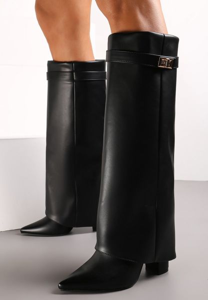 Czarne Kozaki na Słupku z Wywiniętą Cholewką i Noskiem w Szpic Selvaggia