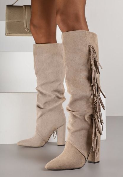 Ciemnobeżowe Kozaki Kowbojki na Obcasie Ozdobione Frędzlami Badorra