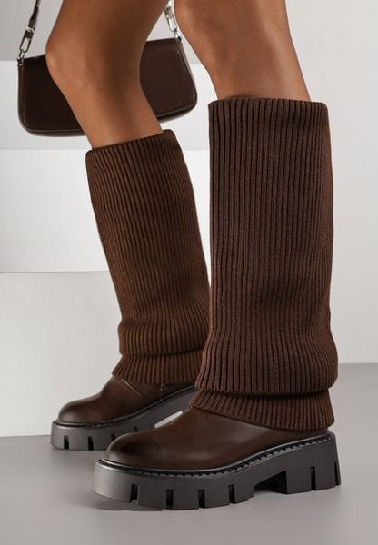 Brązowe Kozaki na Grubej Podeszwie z Wywiniętą Dzianinową Cholewką Fenisana