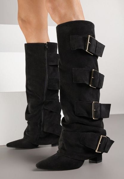 Czarne Kozaki z Imitacji Zamszu na Słupku z Wywiniętą Cholewką Zdobioną Nitami i Klamrą Sagiena