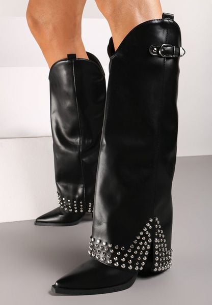 Czarne Kozaki Kowbojki ze Skóry Ekologicznej z Wywiniętą Cholewką Ozdobioną Nitami Irithrea