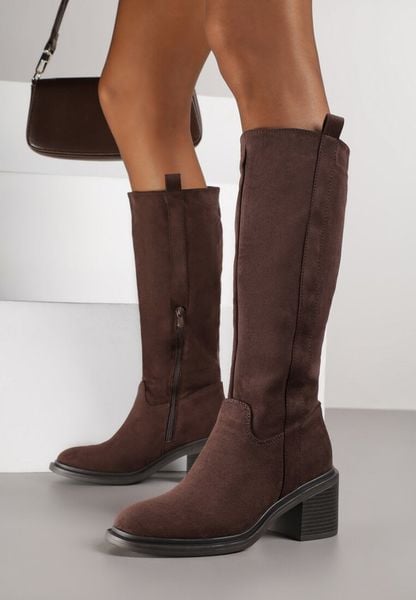 Brązowe Kozaki Oficerki Vices na Obcasie Zdobione Paskami przy Cholewce Giorela