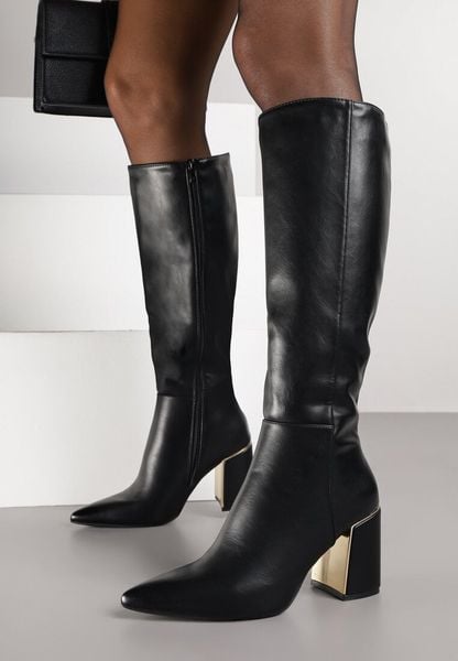 Czarne Kozaki na Słupku z Metalicznym Zdobieniem i Szpiczastym Noskiem Nisfitta