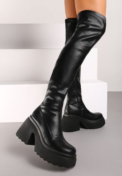 Czarne Kozaki na Platformie i Słupku z Dopasowaną Cholewką za Kolano Geniefra