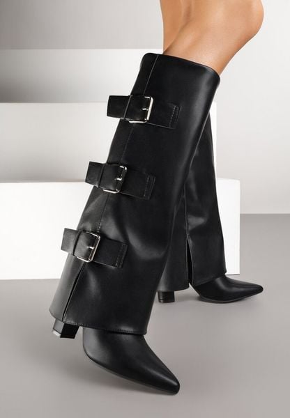 Czarne Kozaki na Słupku Ozdobione Klamrami i Wywiniętą Cholewką Einella