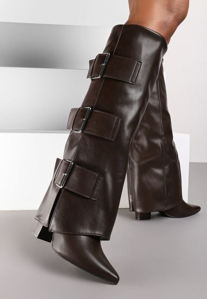 Brązowe Kozaki na Obcasie w Rockowym Stylu z Wywiniętą Cholewką Ozdobione Klamrami Navala
