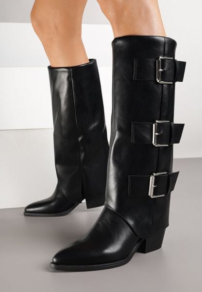 Czarne Kozaki na Słupku Kowbojki Ozdobione Metaliczną Aplikacją i Wywiniętą Cholewką Latareia