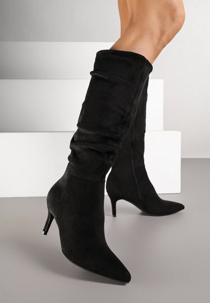 Czarne Marszczone Kozaki z Imitacji Zamszu na Obcasie Typu Szpilka Rilavira